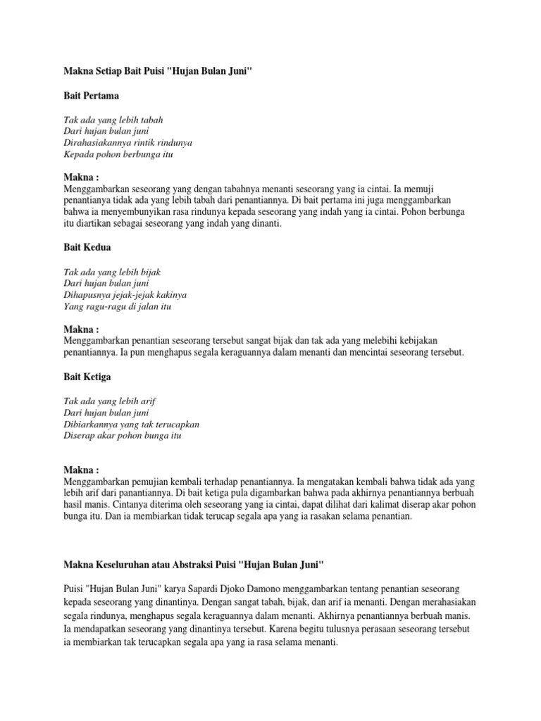 Ah, kalau saja bekasi bisa begini terus, tapi ada sinar matahari, alangkah nikmatnya. Seseorang yang senang menulis puisi, sepertinya belum sempurna kecintaannya pada puisi apabila belum membaca karya yang satu ini. Yanik perempuan indonesia kemenangan di bulan juni yunike 2. Sapardi djoko damono penerbit : Tak ada yang lebih tabah dari hujan bulan juni dirahasiakannya rintik rindunya kepada pohon berbunga itu karena juni bercerita soal ketahanan hati di antara pepohonan cemara, udara dingin dan gebyar hujan menyimpan rahasia yang ditaruh ke dalam secangkir kopi lalu, apa…